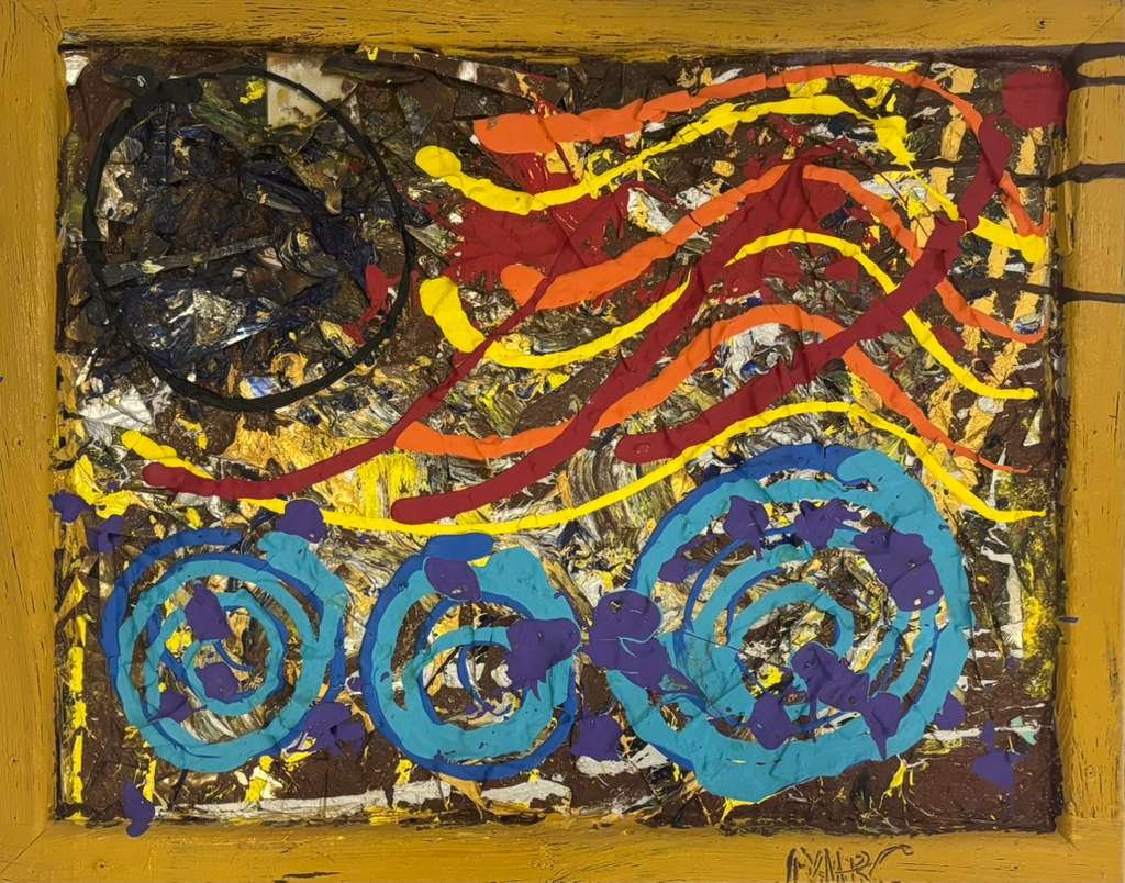 “Abstract Abstract” is a highly textural work created using acrylic paint and glass on luan. The composition features a dense, dark brown background, heavily textured with thick, swirled paint. Across the top, dynamic lines of red, orange, and yellow cut horizontally, suggesting speed or energy. The lower half is dominated by three vibrant, concentric blue and purple spirals. The piece is contained within a simple custom wood frame finished in a bold mustard yellow, and is wired in the back for hanging.