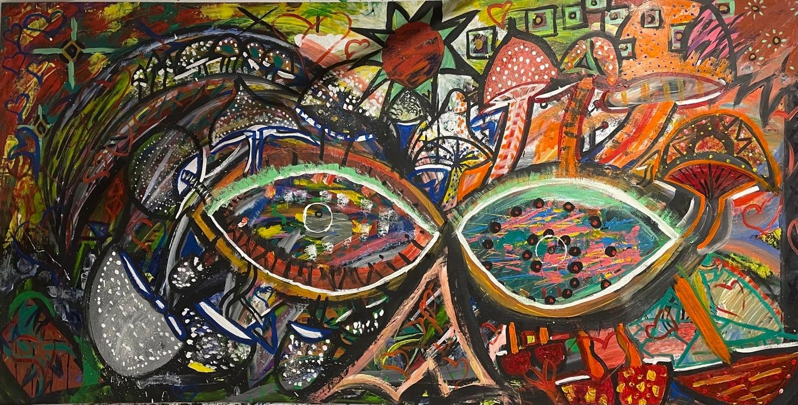 A vibrant, surreal piece dominated by two cosmic eyes that feel like portals into different worlds. Surrounding them are abstract bridges, hearts, and celestial motifs, creating an explosive mix of chaos, love, and imagination.