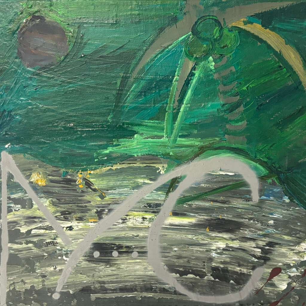 “Green Island Ocean” is a square-format abstract work painted in acrylic on stretched canvas. The upper portion is dominated by dense, thick brushstrokes in various shades of vibrant green, suggesting jungle foliage or a canopy, with a small dark orb or moon visible in the upper left. The lower section contrasts this with horizontal, choppy strokes of gray, black, and white, resembling turbulent water. A large, stylized initial or symbol in light gray is painted over the foreground, adding a contemporary, graffiti-like element.