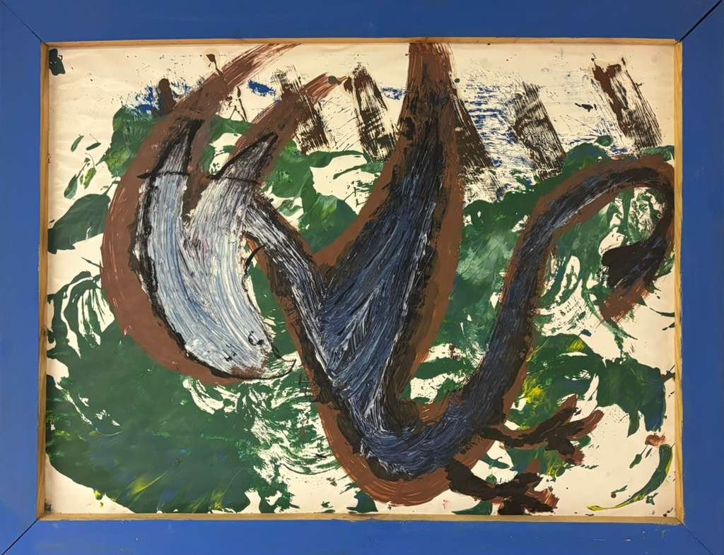 “In Flight” is an expressive abstract work created using a combination of acrylic and oil paint on paper. The horizontal composition is dominated by a large, gestural creature—likely a lizard or dragon—rendered in thick brown and blue-white strokes, seemingly mid-leap or soaring. The background is a mix of swirling dark green foliage and white/brown abstract elements. The piece is set within a bright royal blue custom wood frame and is wired in back for hanging.