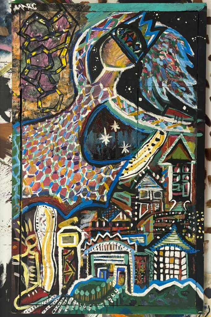 This vibrant painting features a crowned ballerina dancing above a village of colorful, geometric houses. With scales of shifting hues and cosmic stars glimmering across its form, the piece captures themes of guardianship, mystery, and divine presence watching over earthly life.