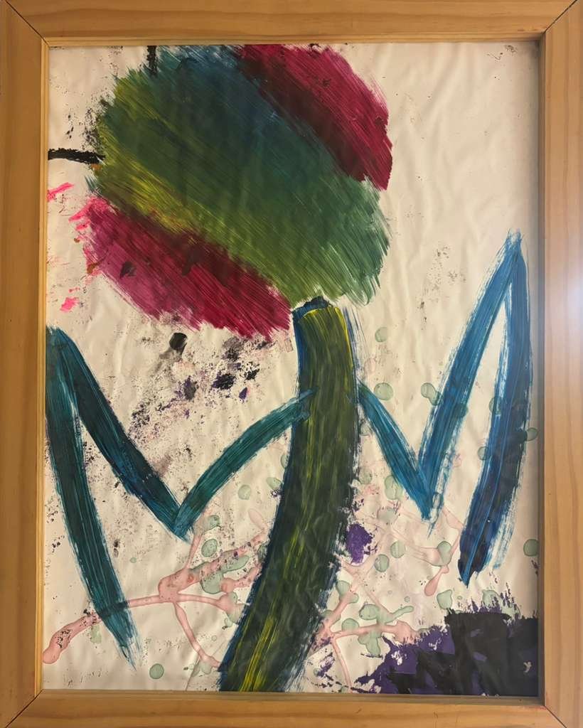 “Praying Mantis” is an abstract work painted in acrylic on paper, featuring bold, simplified forms in vivid colors. The central subject suggests a stylized flower or insect, with a circular form painted in deep magenta and green stripes, supported by a thick green stem. Large, striking blue-green angular shapes flank the sides, while the white background is textured with pink and light green splatters. It is housed in a light-colored, natural custom wood frame and is wired in the back for hanging.
