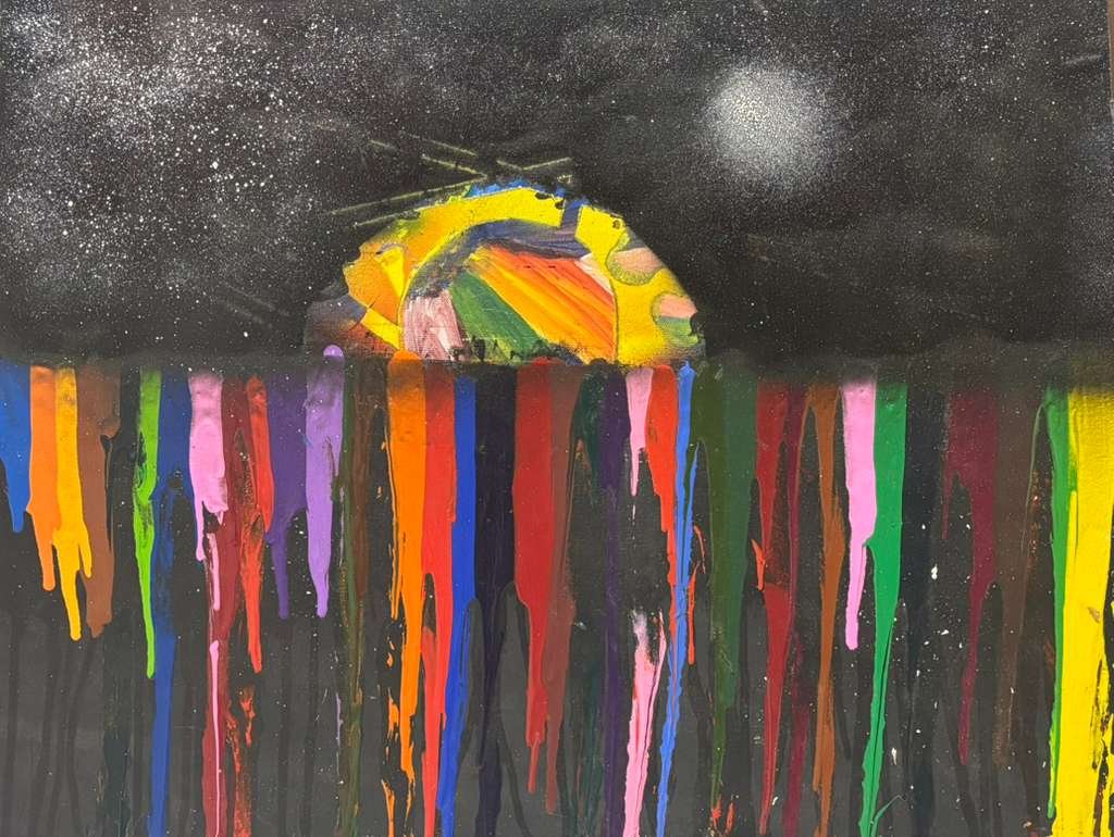 “Sunset On The Beach” is a dramatic, horizontally-oriented abstract work painted in acrylic on stretched canvas. The upper half features a solid, dark black sky heavily dusted with white spray paint splatters (stars), with a pale, foggy moon on the upper right. The lower half is dominated by an array of thick, vibrant, vertical drips in every color—including red, orange, yellow, green, and purple—falling downward against a dark background, suggesting a chaotic, colorful sunset melting over a dark horizon. The piece is wired in the back for display.