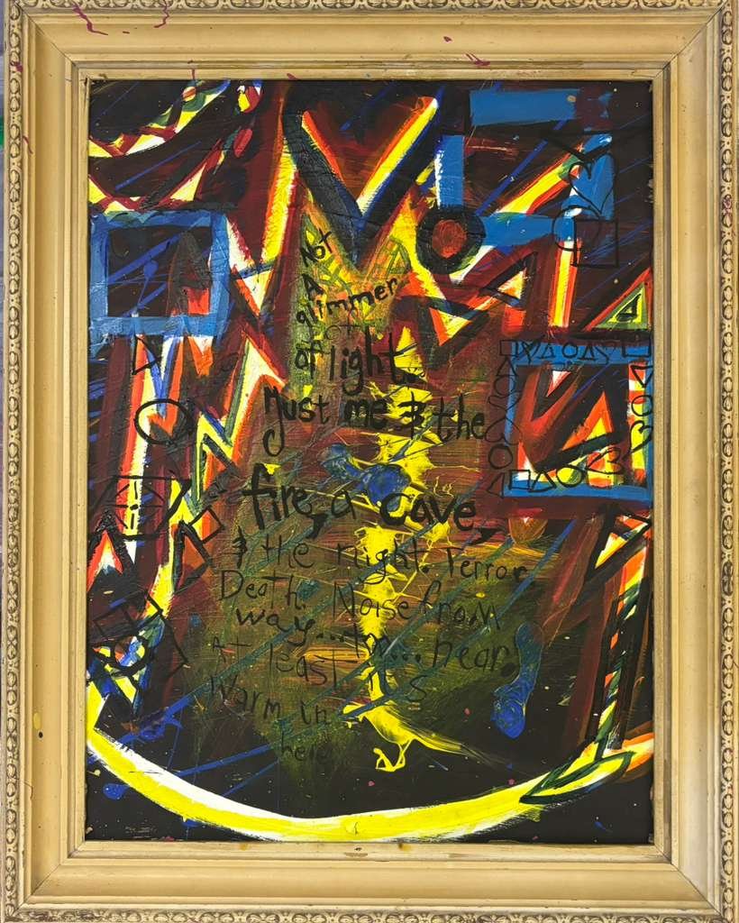 “That Fire” is an intense, textural abstract painting created in acrylic on luan. The vertical composition features a complex, chaotic explosion of color—dominated by deep reds, vibrant yellows, and structural blue lines—all set against a dark background. Handwritten text is layered over the dynamic shapes, adding a narrative dimension to the piece. It is housed in an ornate, decorative wooden frame with a distressed pale gold finish and is wired in the back for hanging.