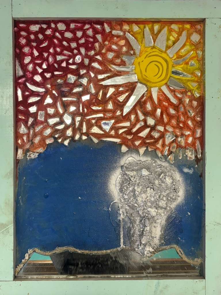 “The Reflecting Tree” is a vibrant, mixed-media artwork. The composition is divided between a bright, abstract sky and a deep blue field below. The upper portion features a collage of shattered mirror fragments and red-orange paint, with a stylized yellow sun radiating light. The lower portion includes a rough, heavily textured white/silver form that suggests a tree or cloud, reflecting in the blue water. The piece is bordered by a light blue-green wood frame.