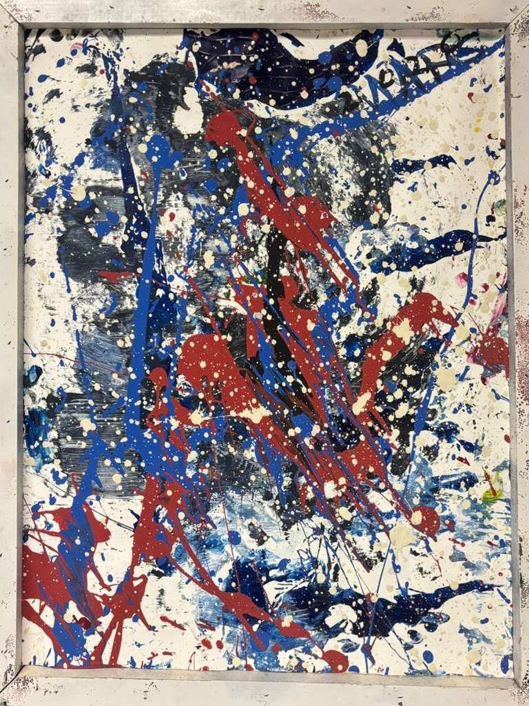 “Ursa Major III” is an expressive abstract work painted in acrylic on paper. The dark, vertical composition is dominated by large, bold strokes of black, blue, and red that form energetic, abstract shapes. These main elements are surrounded by bright white and yellow splatters, resembling a star field. The piece has a dynamic, chaotic energy and is contained within a heavily distressed, multi-colored custom wood frame and is wired in back for hanging.